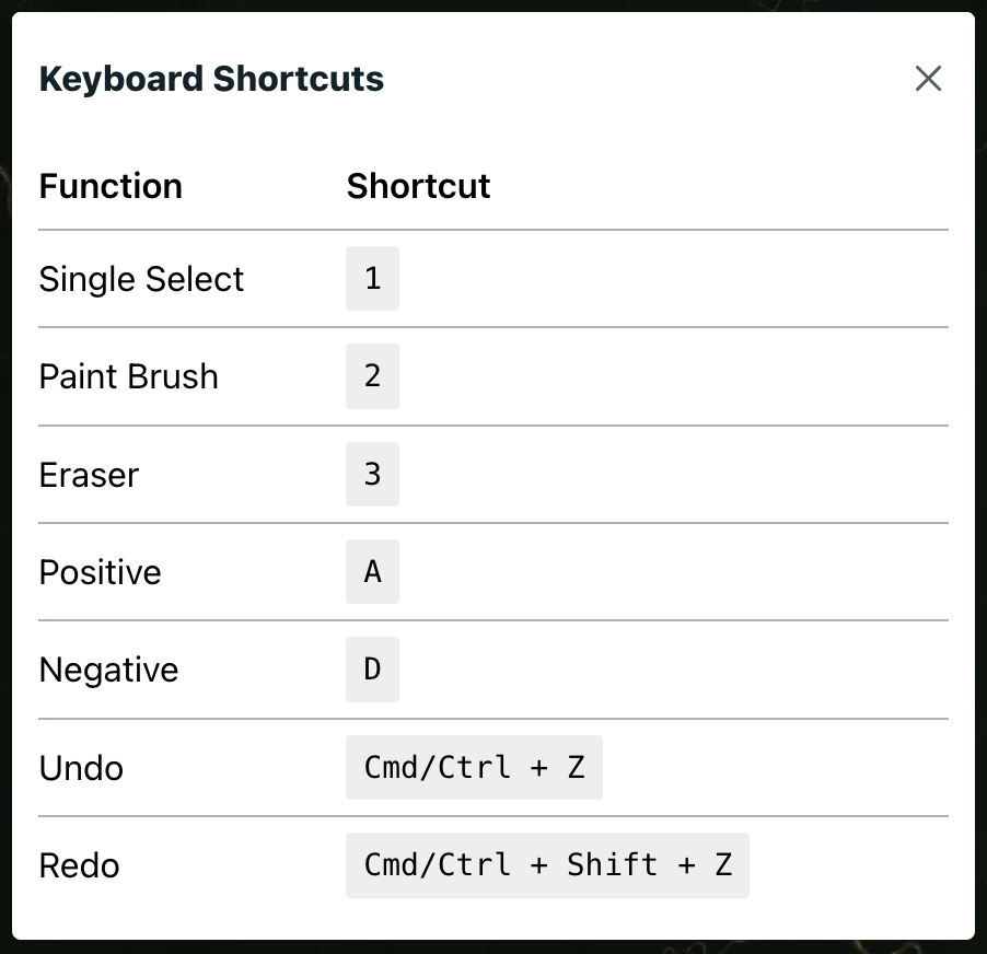 <img src="https://182773137-files.gitbook.io/~/files/v0/b/gitbook-x-prod.appspot.com/o/spaces%2FIQB2eToY1Iv2IH6cERjn%2Fuploads%2FW75ULQF39vxAhDysECN1%2FScreenshot%202024-09-13%20at%206.21.39%E2%80%AFPM.png?alt=media&#x26;token=2bf01875-23a9-4c8d-a2cf-39baebf9a517" alt="" data-size="line"> **Paint Brush:** Use this to designate large areas with positive or negative labels quickly.&#x20;